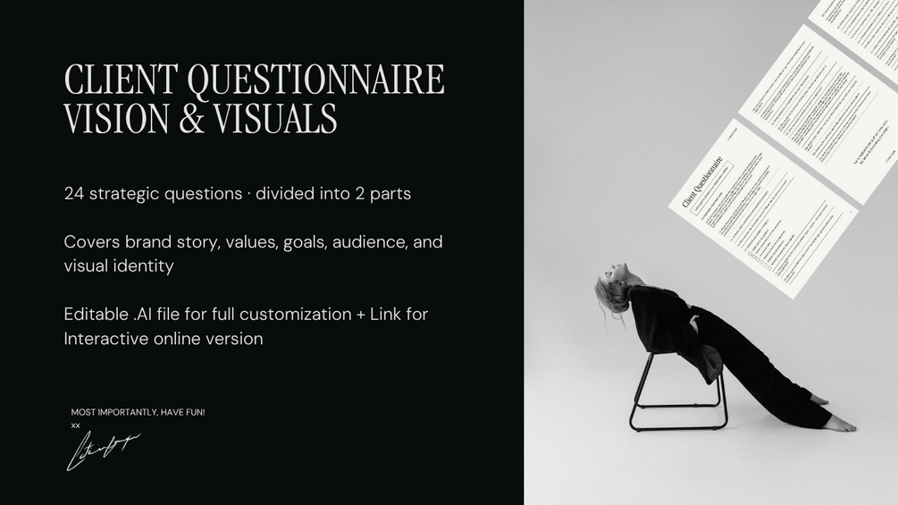 Gain complete clarity from day one with our 24-question Client Questionnaire, designed for brand designers who want to start every project with precision and purpose. Divided into two strategic parts, it covers everything from brand story and values to audience insights and visual direction. Includes an editable Adobe Illustrator file, an interactive online version, and a PDF preview — the exact framework we use with our own high-end clients. Perfect for designers ready to streamline their process and deliver results that exceed expectations.
